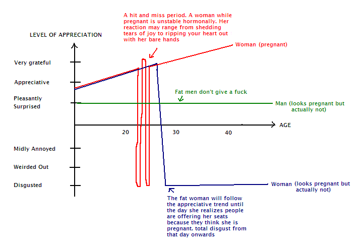 whoever needs it. But it’s more complicated than you think. Some people get offended when you offer them a seat. Lucky for you, I have made a definitive guide on when to offer up your seat. You’re welcome. The graphs below depict how grateful a person is when you, a young stud of a man, offer them a seat. Memorize these graphs and you shall never falter in the seat offering department again!